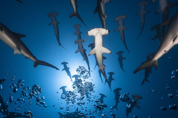 Grupa rekinów młotów pływa spokojnie razem.