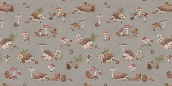 Uroczy wzór z jeżykami wśród jesiennych grzybów, szyszek i żołędzi. Miękka taupe tło i szczegółowe ilustracje wprowadzają ciepłą, leśną atmosferę, idealną do dodania przytulnego i zabawnego akcentu w każdej przestrzeni.