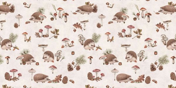 Uroczy wzór z jeżykami wśród jesiennych grzybów, szyszek i żołędzi. Miękka taupe tło i szczegółowe ilustracje wprowadzają ciepłą, leśną atmosferę, idealną do dodania przytulnego i zabawnego akcentu w każdej przestrzeni.