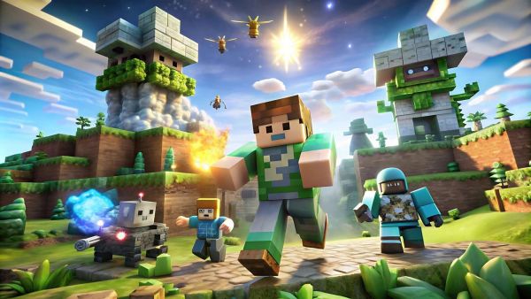 Żywy projekt pixelowego świata z zielonymi dolinami, wieżami pokrytymi roślinnością oraz kolorową obsadą postaci i robotów. Scena jest oświetlona migoczącą gwiazdą i niebieskim niebem pełnym energii i przygód.
