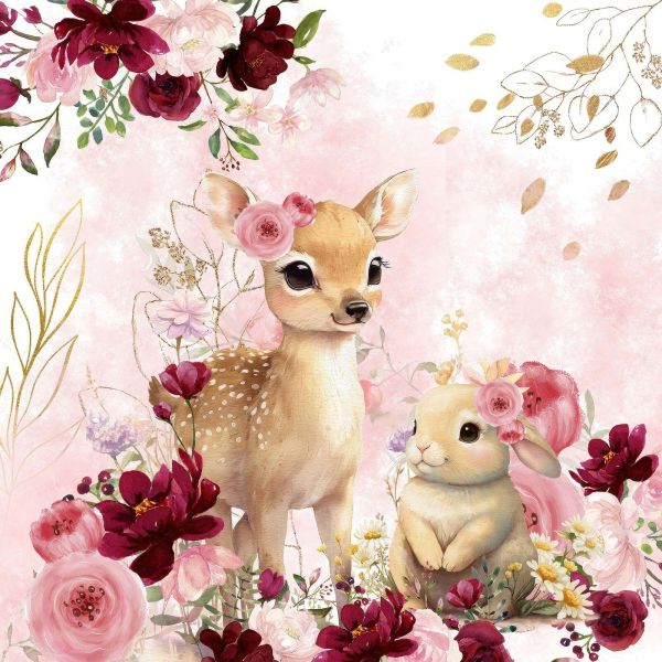 To urokliwe wzornictwo ożywia magię lasu z uroczym jelonkiem i słodkim króliczkiem, oba ozdobione delikatnymi wiankami z kwiatów. Stoją pośród pięknej dekoracji kwiatowej w bogatych odcieniach bordowego, delikatnego różu i kremu, z wyrafinowanymi złotymi akcentami, które dodają odrobinę luksusu. Miękka akwarelowa tło w pastelowym różu nadaje marzycielski i ciepły wygląd.