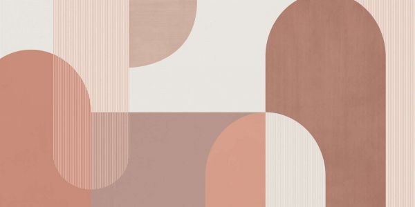 Ten projekt oferuje miękką harmonię ciepłych pastelowych kolorów i uporządkowanych kształtów. Nakładające się na siebie łuki i prostokąty, niektóre z delikatną teksturą w paski, tworzą warstwę, która dodaje zarówno wizualnej głębi, jak i odrobiny elegancji.