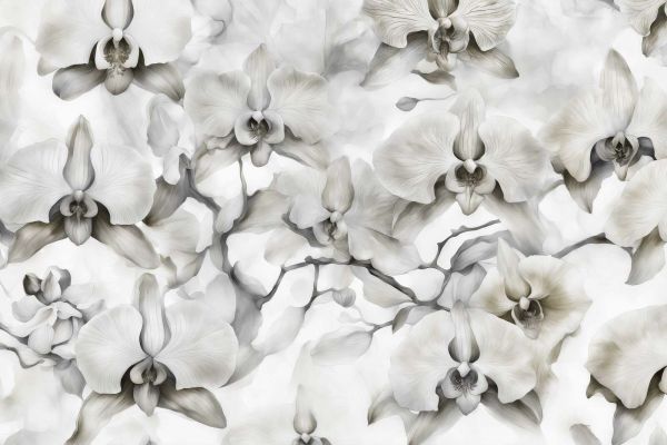 Wyrafinowany design z pięknymi białymi orchideami w delikatnych odcieniach szarości. Szczegółowe płatki kwiatów i finezyjne gałązki tworzą elegancki i spokojny wygląd. Subtelna gra kolorów i jasne tło nadają całości ponadczasowy i luksusowy charakter, idealny do wyrafinowanej i relaksującej atmosfery.