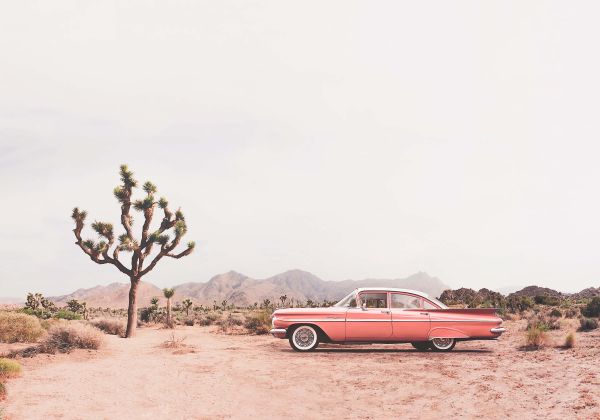 Obraz starszego samochodu na pustyni. Połącz to zdjęcie na przykład w sypialni.