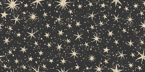 Ekspresyjne niebo gwiaździste pełne ręcznie rysowanych, kremowych gwiazd na głębokim czarnym tle. Figlarne kształty i ziarnista faktura nadają nostalgiczny i żywy charakter.
