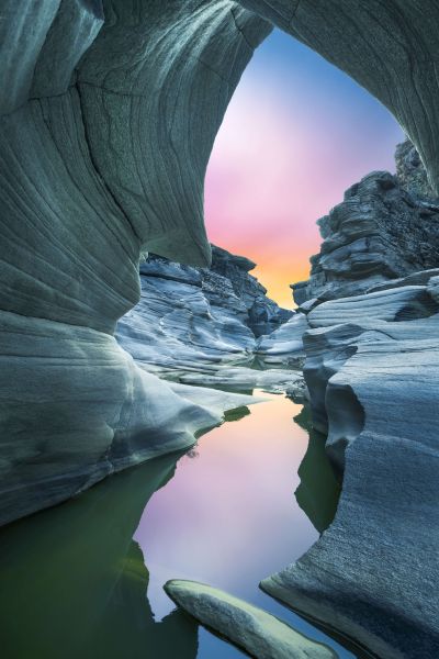 Portret wąskiej jaskini z nieba w różnych jasnych kolorach.