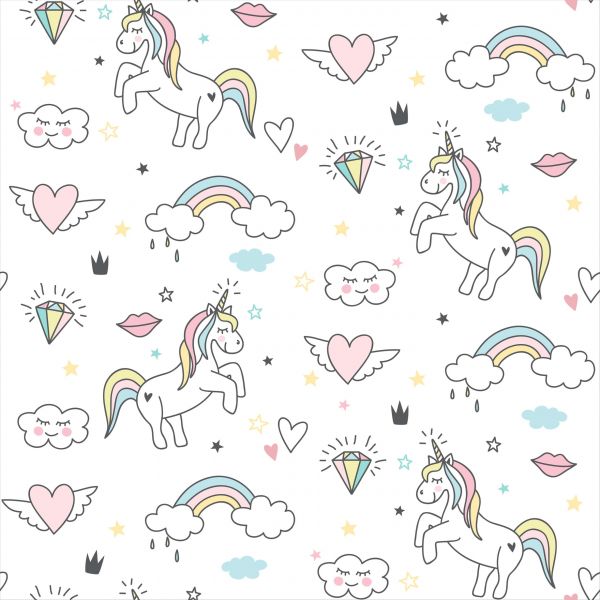 Fototapeta jednorożców z sercami i chmurkami. Ta tapeta jest zabawna dla pokoju dziecięcego.
