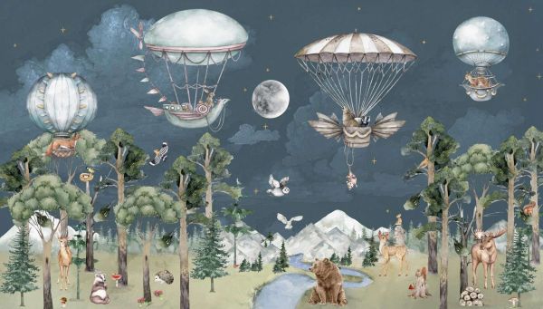 W tej fantazyjnej scenie rozwija się nocna przygoda nad zaczarowanym górskim lasem. Głęboko niebieskie niebo jest usiane gwiazdami, podczas gdy jasny księżyc oświetla krajobraz pełen zwierząt i magii. Duże balony powietrzne unoszą się nad koronami drzew, sterowane przez niedźwiedzie, króliki i sowy. Niektóre zwierzęta radośnie zwisają na spadochronach lub unoszą się na sowich skrzydłach. Na dole, wzdłuż wijącego się strumienia, zbierają się inne leśne zwierzęta: niedźwiedzie, jelenie, lisy i wiewiórki z zachwytem patrzą w górę na spektakl w powietrzu. Paleta kolorów składa się z głębokiego nocnego niebieskiego, sosnowej zieleni, ciepłego brązu oraz akcentów delikatnego różu, kremu i srebra. Ta kombinacja nadaje całości magiczną, ale jednocześnie spokojną atmosferę. Projekt doskonale pasuje do dziecięcych pokoi o tematyce przygodowej lub przyrodniczej. Pomyśl o drewnianych meblach, miękkim oświetleniu w kształcie gwiazd lub księżyców oraz pościeli z leśnymi lub powietrznymi motywami. Ta ilustracja jest idealna dla dzieci, które kochają przygody, fantazję i zwierzęta. Oferuje nieskończone możliwości do opowieści na dobranoc i pobudza zabawę oraz wyobraźnię. Projekt pięknie prezentuje się jako element przyciągający wzrok w sypialni lub pokoju zabaw, zwłaszcza w połączeniu z naturalnymi materiałami i uspokajającymi kolorami. Balony, góry i zwierzęta zostały opracowane z dużą dbałością o szczegóły, co sprawia, że ilustracja wciąż fascynuje. Kontrast między ciemnym niebem a jaśniejszym krajobrazem tworzy przyjemną równowagę między napięciem a spokojem. Kompozycja daje poczucie głębi i ruchu, jakbyś sam stał się częścią tej nocnej przygody.
