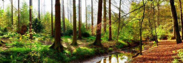 Panorama jesiennego lasu z jasnym światłem słonecznym prześwitującym przez drzewa.