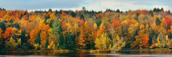 Jezioro z jesiennymi drzewami w różnych materiałach