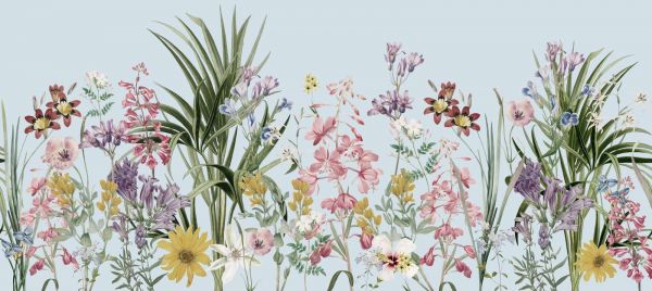 Un exuberante campo de flores en abundancia de colores, desde suaves tonos pastel hasta profundos tonos tierra. Los girasoles de color amarillo brillante y las delicadas flores de color púrpura se combinan con un follaje verde fresco. El diseño irradia alegría y aporta una sensación alegre y veraniega a cualquier habitación.