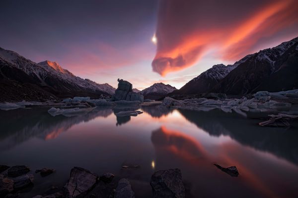 Zachód słońca nad jeziorem, na którym wciąż jest lód. Góry w tle pokryte są śniegiem.
