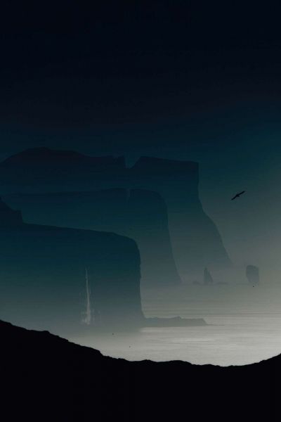 To zdjęcie emanuje tajemnicą i spokojem. Wiele masywnych klifów rysuje się w warstwowej perspektywie, każdy subtelnie zatarty przez gęstą mgłę niebiesko-szarej mgły. Odcienie kolorów są głębokie, stonowane i niemal monochromatyczne: wariacje nocnego niebieskiego, stalowego szarości i chłodnej morskiej zieleni dominują w kompozycji. W oddali ptak przelatuje przez powietrze, mały, ale potężny element, który wprowadza ruch w tym w przeciwnym razie zamrożonym świecie.