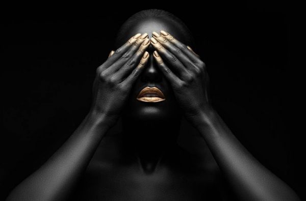 Tapeta z czarną, pomalowaną na czarno kobietą z pomalowanymi na złoto paznokciami i złotą szminką.