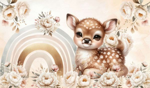 To projekt emanuje urok natury, wprowadzając do wnętrza urocze jelonki siedzące wśród bujnych kwiatów. Duże, słodkie oczy i miękka sierść jelonka promieniują poczuciem spokoju i niewinności. Za jelonkiem błyszczy stylowa tęcza w ciepłych odcieniach beżu i kremu, wykończona subtelnymi złotymi akcentami, które dodają odrobinę elegancji.