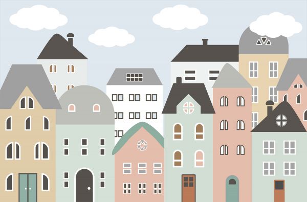 Ilustracja z kilku kolorowych domów z chmurami na niebie.