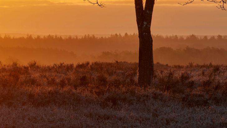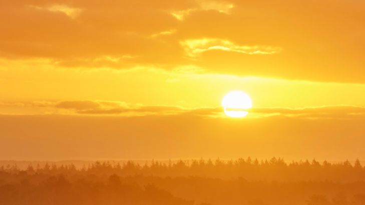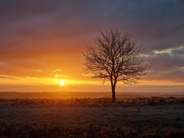 Kolorowy wschód słońca na wrzosowisku. Dzięki tej fototapecie w Twoim domu, możesz cieszyć się pięknym wschodem słońca każdego dnia.