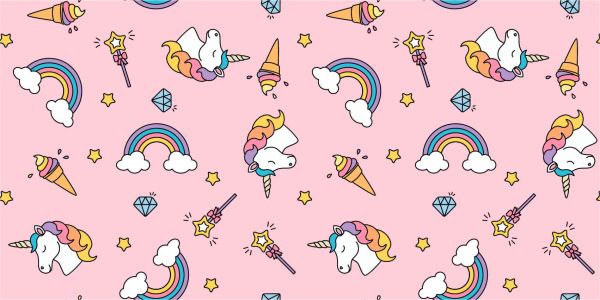 Tapety z wzorem kolorowych jednorożców, tęczy i lodów na różowym tle.