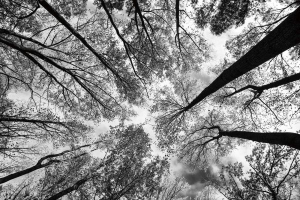Potężna gra linii wysokich drzew rozciągających się od środka ku niebu, przedstawiona w kontrastowym czarno-białym. Wizualny efekt głębi, który wywołuje spokój i podziw.