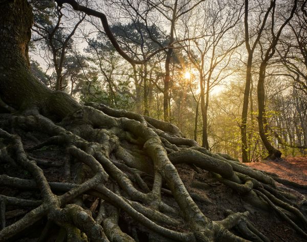 Ozdobne korzenie drzew nad ziemią o wschodzie słońca.