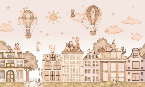 Ta urocza ilustracja przedstawia fantazyjny pejzaż miejski z ozdobnymi domami w różnych kształtach i wysokościach. Na dachach bawią się urocze zwierzątka takie jak kotki, misie i króliczki, podczas gdy nad miastem balony na gorące powietrze spokojnie unoszą się w powietrzu. Małe chmurki, gwiazdki i przyjazne słoneczko nadają zabawny i bajkowy nastrój. Kolorystyka składa się z ciepłych odcieni ziemi takich jak beż, piasek i jasnobrązowy, uzupełnionych subtelnych akcentów miękkiej zieleni i brzoskwini. Dzięki temu powstaje przytulna i zachęcająca atmosfera o spokojnym, harmonijnym wyglądzie.