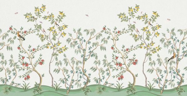 Krajobraz z drzewami owocowymi w różnych materiałach
