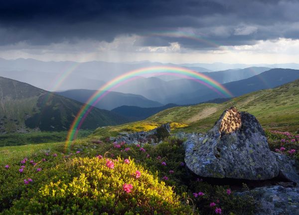 Krajobraz z kwiatami i tęczą. W krajobrazie widoczne są dwie tęcze, jedna nieco bardziej rozmyta od drugiej.