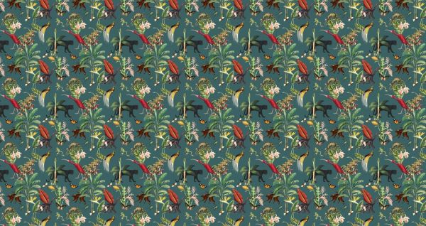 Ten wzór zanurza cię w egzotycznej dżungli pełnej żywych detali. Papugi, małpy i motyle poruszają się wśród bujnych tropikalnych roślin i kwiatów, podczas gdy bogaty zielony odcień tła wzmacnia naturalną energię lasu deszczowego. Jasne czerwone, żółte i pomarańczowe akcenty nadają całości dynamiczny i zabawny wygląd, który przypomina o przygodach głęboko w tropikach.