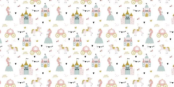 Wzór księżniczek, zamków i powozów na białym tle.