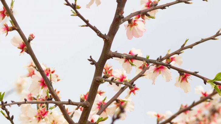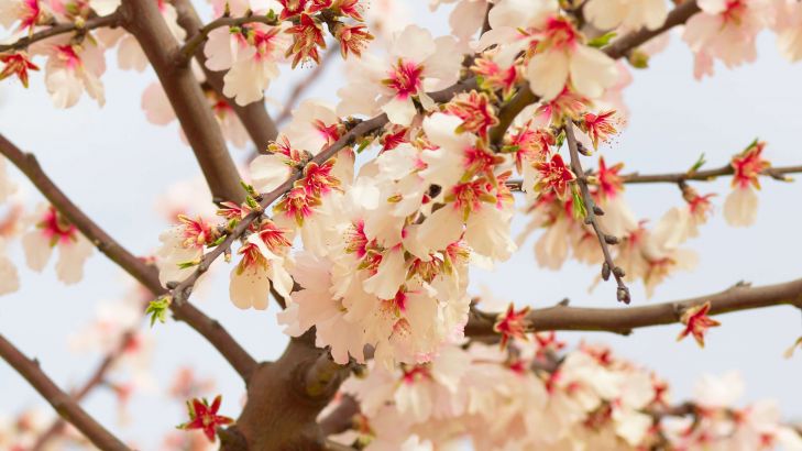 Zbliżone zdjęcie gałązki kwiatowej z wyraźnym niebieskim niebem.