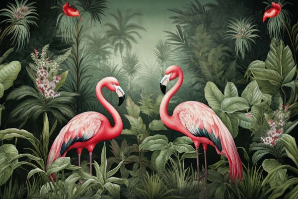 Dwa eleganckie flamingi stoją pośród bogactwa tropikalnej roślinności, ich różowe pióra kontrastują z głębokozielonym tłem. Scena emanuje atmosferą spokojnego piękna, gdzie każdy element przyczynia się do uczucia spokoju i naturalnej harmonii.