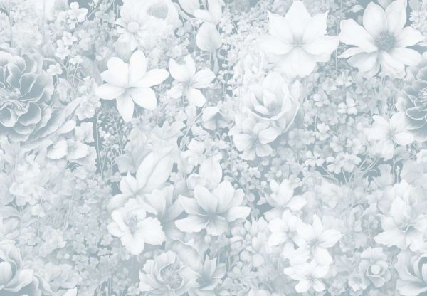 Orzeźwiający wzór kwiatowy z białymi i niebiańsko niebieskimi kwiatami, otoczony świeżo zielonymi liśćmi. Jasne, przewiewne niebieskie tło nadaje energiczny, ale zrelaksowany wygląd. Mieszanka jasnych i nieco głębszych odcieni niebieskiego tworzy subtelny, zabawny efekt.