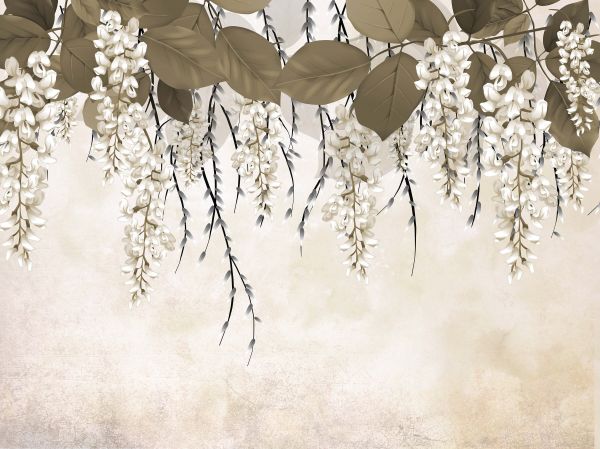 Kwiaty akacji na beżowym tle. Dzięki tej fototapecie w pokoju można poczuć się tak, jakbyśmy mieli w nim żywopłot z kwiatów.