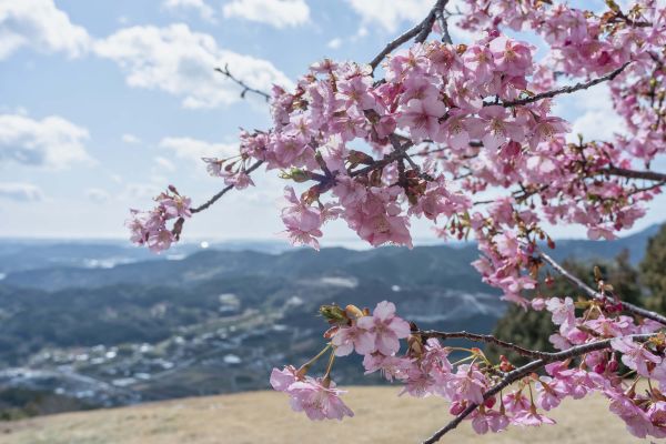 Szczegółowy obraz różowych japońskich kwiatów z górami w tle.