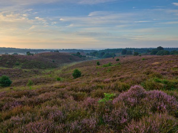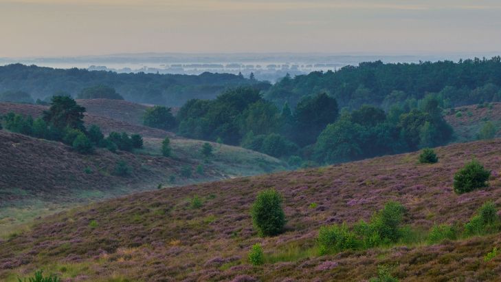Kwitnące wrzosy na wzgórzach. W oddali, nad wrzosami wciąż unosi się poranna mgła.