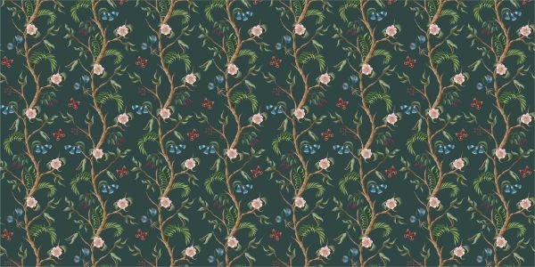 Głęboka zieleń liści i mocne brązowe gałęzie stanowią kanwę dla nocnego tańca kwiatów i motyli.