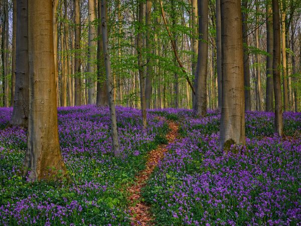 Piękna ścieżka przez las otoczona hiacyntami leśnymi. W tym lesie od razu wyróżniają się piękne fioletowe kwiaty.