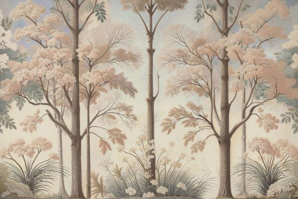 De combinatie van een verfijnd boslandschap, zachte bloesems en een ingetogen kleurenpalet maakt dit beeld tijdloos, elegant en breed inzetbaar binnen diverse interieurstijlen. -> Połączenie wyszukanego krajobrazu leśnego, delikatnych kwiatów i stonowanej palety kolorów czyni ten obraz wiecznym, eleganckim i szeroko zastosowalnym w różnych stylach wnętrz.