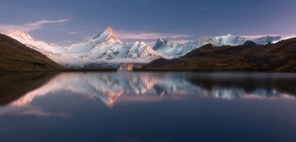 Jezioro Bahalpsee, w tle widać chmury pomiędzy ośnieżonymi górami.