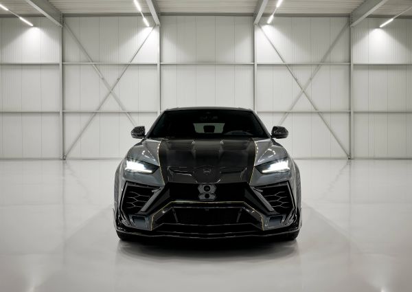 Mocne zdjęcie Lamborghini Urus Mansory w białym korytarzu.