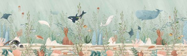 Ta marzycielska podwodna kraina zabiera cię w spokojne głębiny oceanu, gdzie barwna kolekcja morskich zwierząt spokojnie pływa. Między kołyszącą się trawą morską i rafami koralowymi odkrywasz ciekawskie orki, przyjazne wieloryby, eleganckie płaszczki, żółwie morskie i ławice małych rybek. Także lwa morskiego, otary, meduzy i kraby znajdują drogę między kolorowymi muszlami a miękkimi, piaszczystymi ławami. Paleta barw składa się z serene aquatinten, jasnozielonych, niebiesko-szarych i pastelowo-różowych odcieni, które razem tworzą kojący, naturalny wygląd. Styl ilustracji jest delikatny i ręcznie rysowany, z płynnymi konturami i harmonijną kompozycją, która podwodny świat w zabawny sposób ukazuje bez wizualnego natłoku. Ten projekt doskonale pasuje do skandynawskiego lub zabawnego morskiego wnętrza, z akcentami naturalnego drewna, miękkich tkanin, dodatków w motywie morza i jasnymi ścianami. Idealny do pokoju dziecięcego z motywem oceanu lub plaży, gdzie projekt dodaje uspokajającej, a jednocześnie wyobraźniowej atmosferze. Pomyśl o połączeniu z drewnianymi meblami, pojemnikami w kształcie ryb do przechowywania i tkaninami z motywami gwiazd morskich lub muszli. Bardzo odpowiedni do pokojów niemowląt, pokoi przedszkolnych czy kącików zabaw, gdzie relaks i wyobraźnia idą w parze. Podwodny świat wciąż zaprasza do odkrywania: które zwierzę tam pływa? Gdzie chowa się żółw? Przyjazny wygląd każdego zwierzęcia czyni projekt przystępnym dla małych dzieci. Dzięki bogactwu detali, spokojnym kolorom i łagodnemu wyglądowi ten projekt tworzy punkt odpoczynku w każdym pomieszczeniu – podwodny świat pełen życia, bez zgiełku, doskonale zbalansowany.