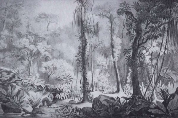 Wyrafinowana interpretacja tropikalnego listowia w subtelnych odcieniach szarości, z delikatnym rozproszonym światłem przenikającym przez koronę drzew. Liany i palmy tworzą spokojną i nowoczesną atmosferę pełną elegancji i warstwowości.