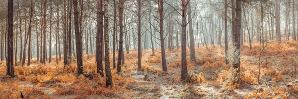 Las w okresie jesiennym. Liście w lesie są już ładnie zabarwione na pomarańczowo.