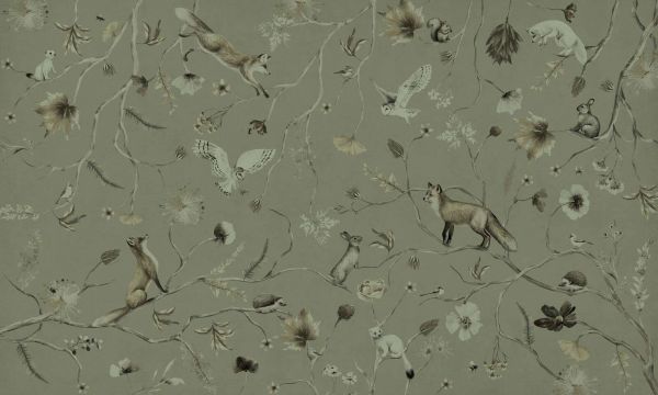 Lisy, sowy, łasice i jeże odpoczywają na ozdobnych gałęziach pełnych suchych liści i kwiatów. Delikatne tło w kolorze mchu i naturalne odcienie ziemi nadają temu wzorowi spokojny i powściągliwy wygląd.