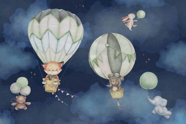 Śliczne zwierzęta latające i unoszące się na niebie z zielonymi balonami.