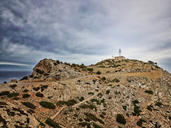Mała przybrzeżna latarnia morska z wysokimi skałami.