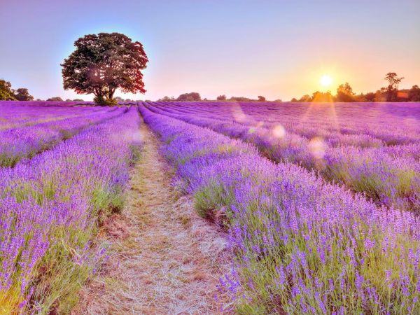 Wczesne promienie słońca kąpią pole lawendy w ciepłym świetle, podczas gdy majestatyczne drzewo czuwa nad kolorowym krajobrazem. Spokojna przestrzeń zachęca do odpoczynku i kontemplacji we wczesnych godzinach porannych.
