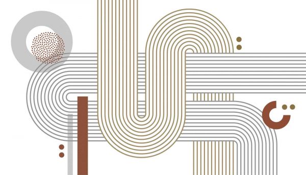 Ten projekt bawi się iluzją głębi dzięki nakładającym się warstwom linii o różnych grubościach. Połączenie beżu i szarości, wraz z kropkami i okrągłymi wzorami, daje dynamiczne, ale uporządkowane wrażenie.