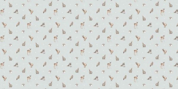 Uspokajający wzór z leśnymi zwierzętami, takimi jak jelenie, sowy, jeże, króliki i szopy pracze, na świeżym lodowoniebieskim tle. Połączenie naturalnych ilustracji zwierząt i delikatnych kolorów tworzy marzycielski i lekki efekt.