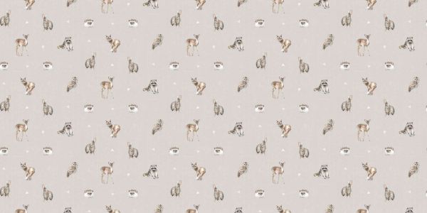 Zabawny wzór z jeleniami, sowami, jeżami, królikami i szopami na miękkim taupe tle. Zwierzęta są subtelnie narysowane w naturalnych odcieniach brązu, co tworzy uspokajającą i przyjazną całość.